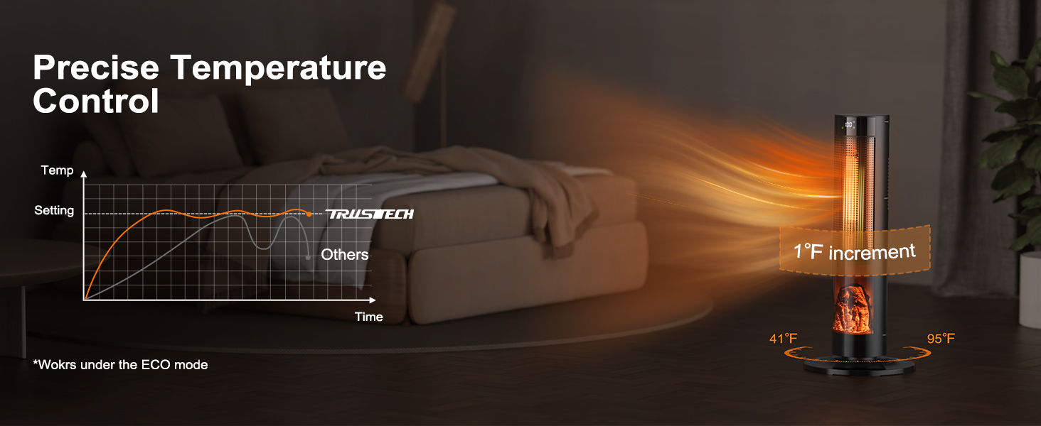 [Quiet Heating Your Winter Night] Elevate your ambiance with the stylish 3D flame effect of the TRUSTECH space heater. It doubles as a captivating night light, infusing your home with a cozy winter glow. Moreover, the space heater has a 1-12 hour timer, granting you the luxury of uninterrupted sleep on frosty evenings without worrying about manually turning off the tower heater.