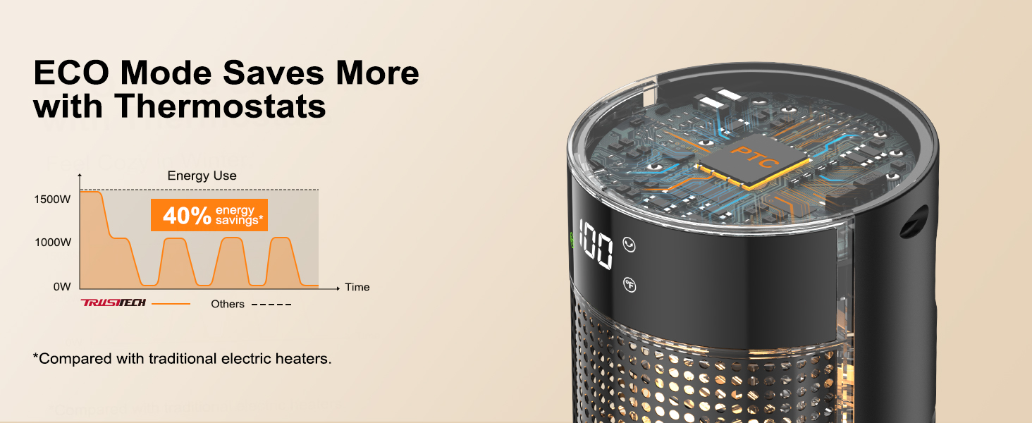 - [Rapid and Extensive Warmth] Harnessing the power of efficient 1500W PTC heating elements, the TRUSTECH 25.6-inch electric space heater offers comforting warmth in 2 seconds. With a sweeping 60° oscillation, it elevates air circulation, ensuring a cozy embrace in every corner of your space. This upgraded electric space heater is an excellent choice for both offices, bedrooms, and living rooms. The most ideal heating coverage is under 130 sq. ft.