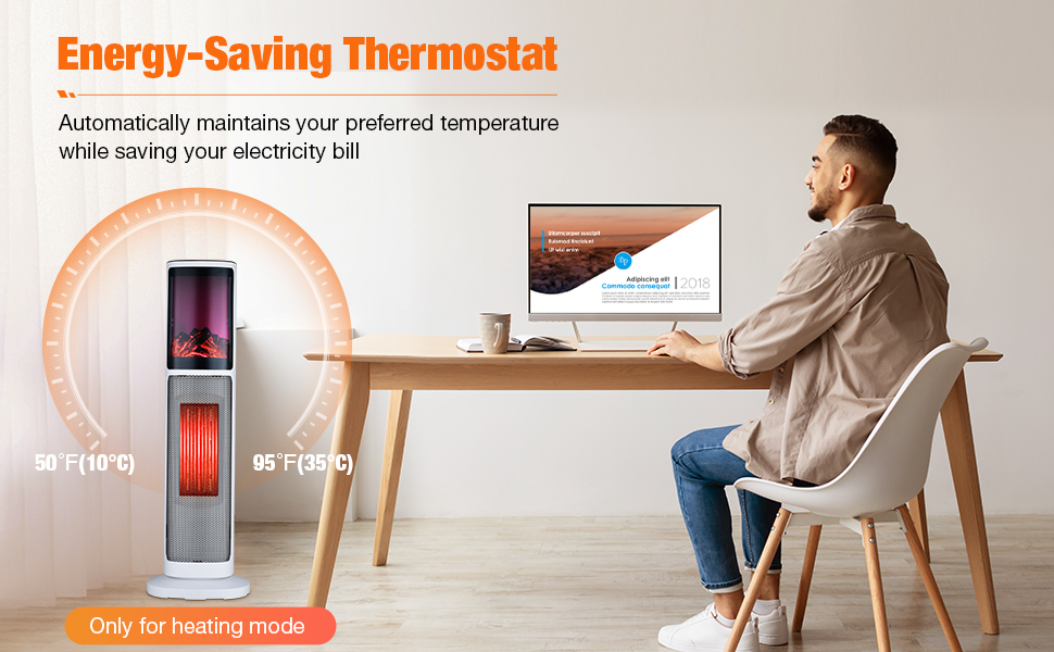 With the adjustable thermostat, you can set the temperature from 50℉ (10℃) to 95℉ (35℃) with a 1℉ increment. The space heater automatically adjusts according to your set temperature and the ambient temperature.