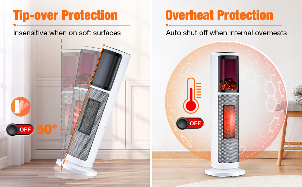 Overheat Protection: When the internal elements of the electric space heater for home overheat, it will shut off automatically to prevent danger in your house. The tower space heater will return to normal use after unplugging and re-plugging.