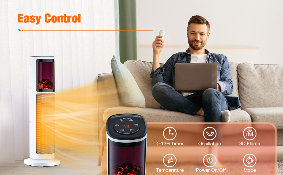 [Convenient Remote Control] Besides the touch panel on the head, the tower heater for office comes with a remote control that allows you to easily control turn-on/off, operation modes, oscillation, temperature, timer, and 3D flame on/off when lying comfortably on your couch. There is an ambient temperature on the LED display of the electric space heater for indoor, for your convenience.