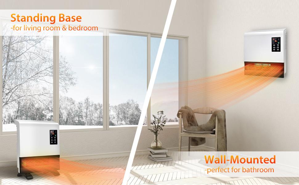 - 2-in-1 Wall-Mounted and Freestanding Heater: Our Wall heater can be used both as a wall-mounted unit and as a freestanding device. The wall-mounted option is easy to install, saving floor space, while the freestanding option features a sturdy base for easy mobility between rooms and quick setup. It’s perfect for providing extra warmth in bathrooms, garage and basement during winter