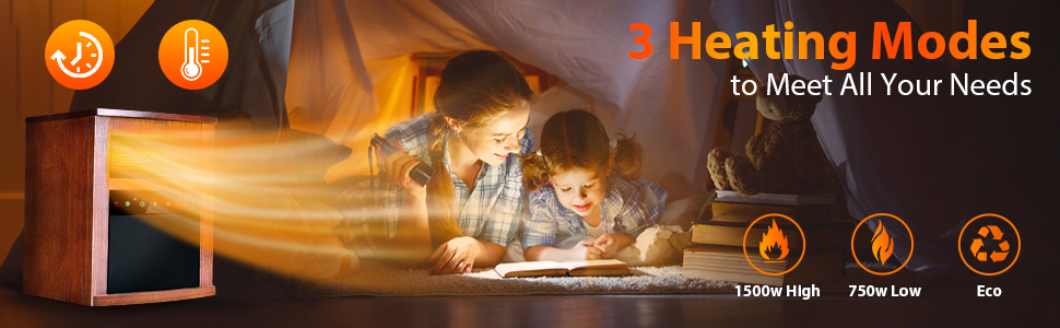 - Multi-places and Smart Modes: The indoor space heater carries 3 heat modes; The high heat of an electric space heater will distribute 1500 watts of sun-like warmth; The low mode will deliver 750 watts of warm airflow; Eco mode of the infrared space heater will save you up to 300 watts of energy; The infrared heater is ideal for multiple living spaces, offices, and bedrooms; Moreover, the electric room heaters can quickly heat up your room in seconds, you don’t have to wait in the cold room anymore